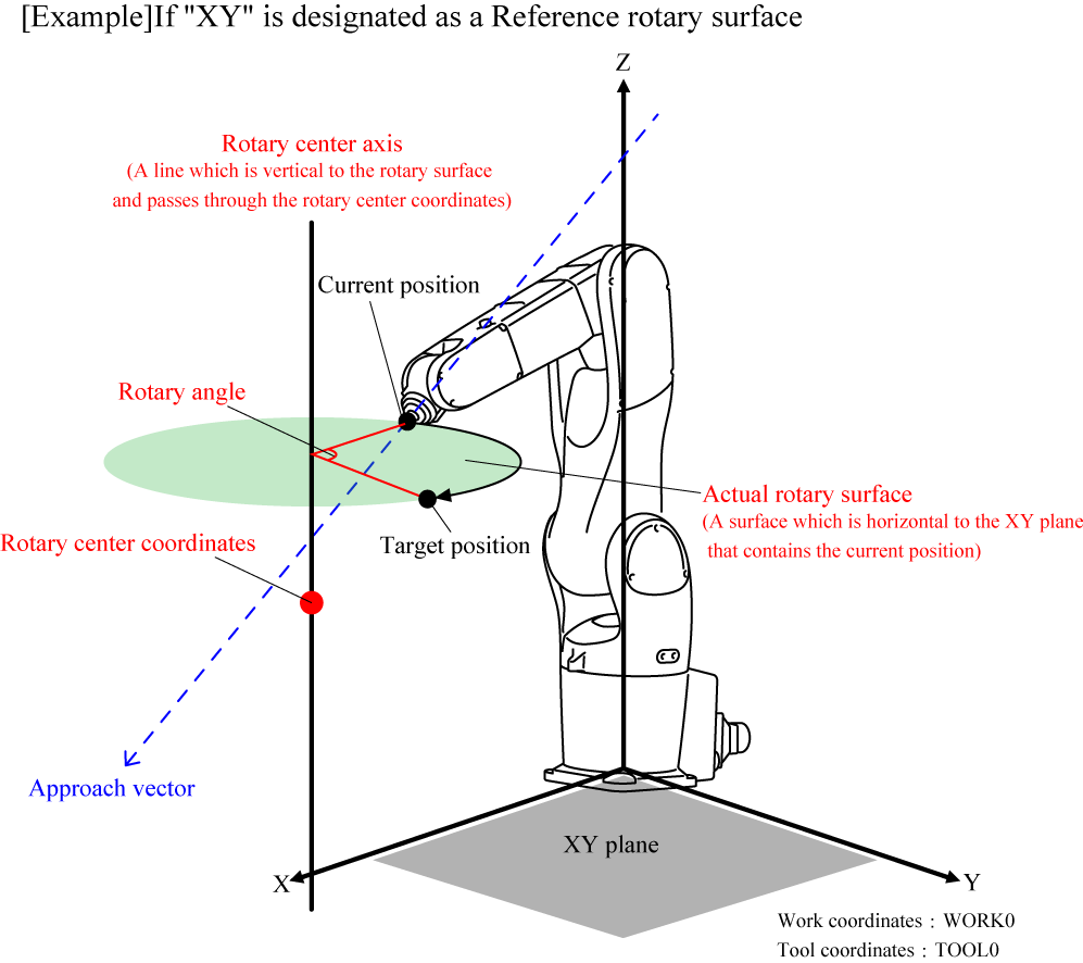 If the approach vector on the current position is horizontal to the actual rotary surface, it is impossible to determine the rotation direction. As a result, a robot may move in different direction even if the same motion is performed. In that case, change the current position and/or the condition of the actual rotary surface, or enable static. When "static = [Enable]" is specified, the vector direction of the rotary center axis is determined regardless of the direction of the approach vector. For details, refer to the following explanation.