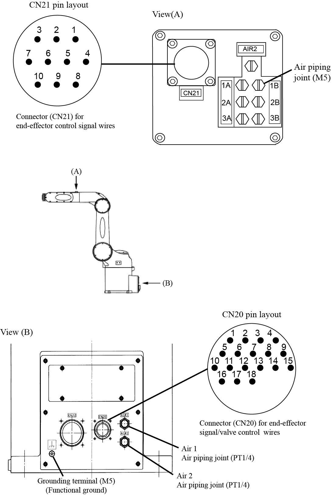Pin #1 to #10 on CN21 and those on CN20 are connected with each other. The allowable current per line is 1 A.