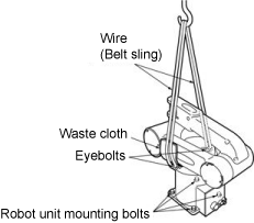 Pass the hoisting wires through the specified eyebolts as illustrated below. Passing them through other sections may drop the robot unit, resulting in a broken robot or bodily injuries.