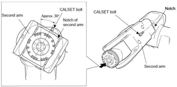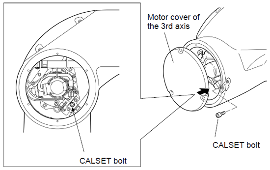 As a CALSET jig, a special bolt (CALSET bolt) is provided inside the 3rd-axis motor cover in the robot unit.