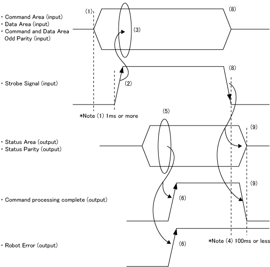 9. As soon as the strobe signal is turned OFF, the controller turns OFF the status area and the command processing complete signal. The Robot Error signal, which is outputted due to a command processing error, remains ON until Clear Robot Error is executed.