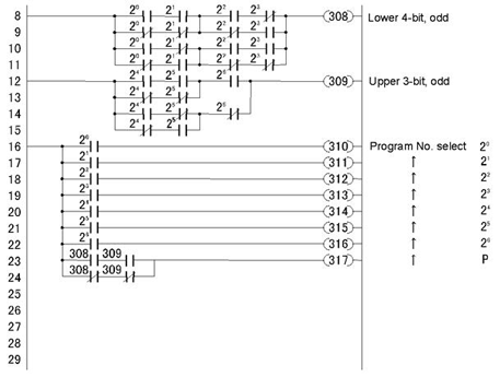 - As shown in the table given on the next page, the program No. select signal is made up of eight bits of 20 to 26 and the parity bit.