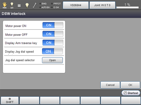 | Display Jog dial speed | When this option is enabled, you can change the robot speed to the custom speed value by the jog dial during the arm traverse key is displayed (a state of deadman switch is pressed) in manual or teach check mode. |