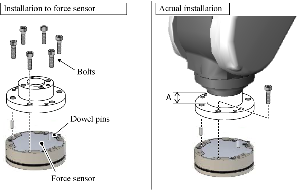 In actual, install the force sensor mounting stay to the flange of the robot, and then install the force sensor. Therefore, dimension A in the lower-right figure needs to be high enough to tighten bolts.