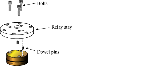 Next, install the force sensor mounting stay to the flange. After that, install the relay stay with the force sensor to the force sensor mounting stay.