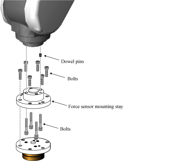 To install the force sensor mounting stay to the flange of the robot, use dowel pins and bolts as shown below.