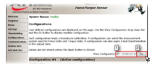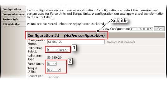Once the window is updated, confirm that the values are "1000000" for [Counts per Force] and [Counts per Torque] in the subtitle [Configuration #1 (Active configuration)].