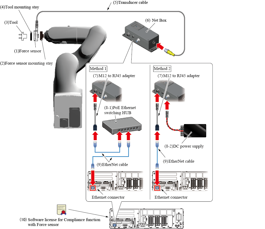 An adapter (a cable) to connect the Net Box and a robot controller through Ethernet cable. You can purchase it from ATI Industrial Automation. Or this can be made by customer. For details, refer to the instruction manual published on ATI Industrial Automation website. |
