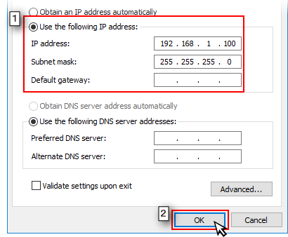 IP address 192.168.1.100 Subnet mask 255.255.255.0 - Select [OK] button.