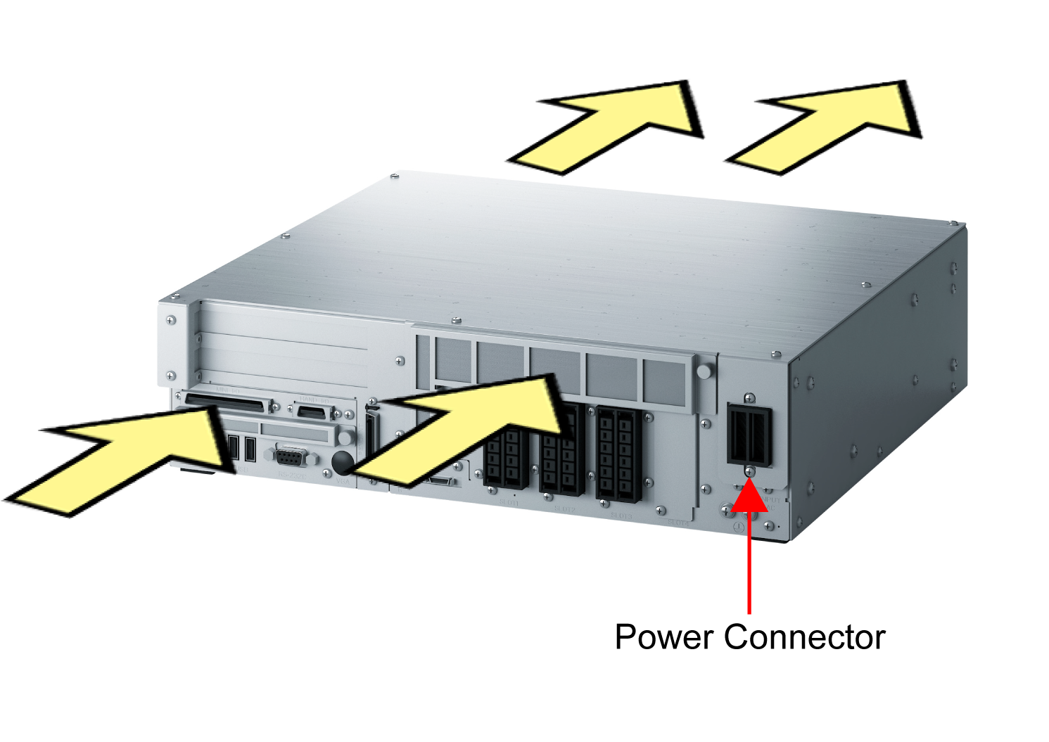 The robot controller has no air filter on the air outlet side. In wall-mounted installation, therefore, to prevent free-fall dust or dirt from getting into the controller, set up the controller with the air outlet side not facing upward.