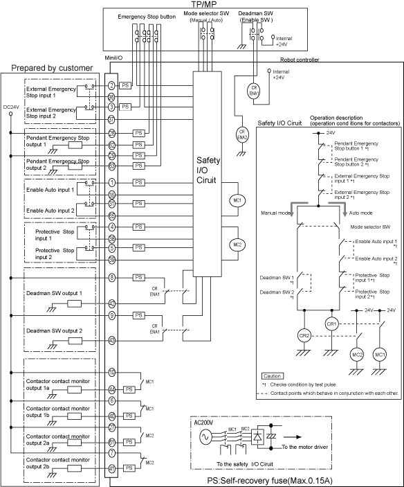 The figure below shows an internal connection equivalent circuit for the safety circuit in the controller. The actual safety circuit is configured with safety relays and others.