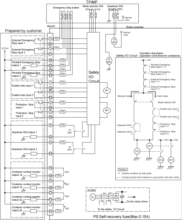 The figure below shows an internal connection equivalent circuit for the safety circuit in the controller. The actual safety circuit is configured with safety relays and others.