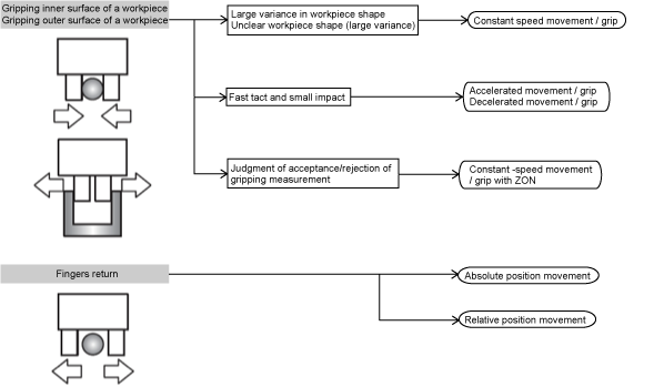 | Constant speed movement / grip | Open | Gripping inner surface of a workpiece • Unclear workpiece shape (large variance) • Large impact on a workpiece |