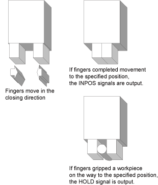 In the Constant-Speed Move and Grip (OPEN/CLOSE) mode, the fingers can move in the closing or opening direction at the specified speed and grip a workpiece with the specified gripping force. After they finish traveling to the stroke end in the closing (or opening) direction, the INPOS signals are output. If they grip a workpiece during the stroke, the HOLD signal is output.