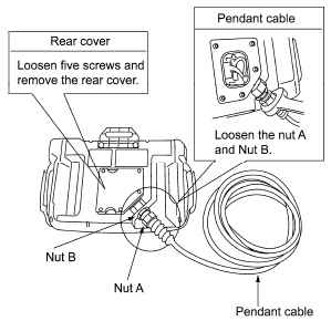 Tech pendant has waterproof construction (IP65). Replace the cable with caution by following the procedure given below when replacing the cable. Pay attention when replacing cable; otherwise, it may deteriorate waterproof performance.