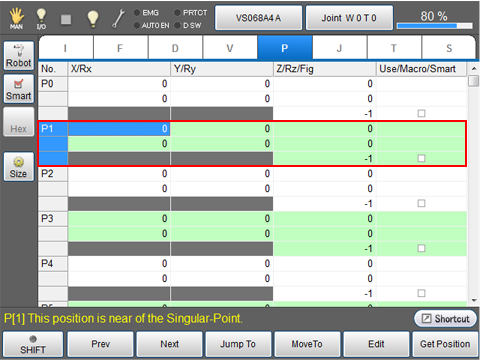 Press moving direction keys as required while pressing the deadman switch to move robot to the position to be set as P1.