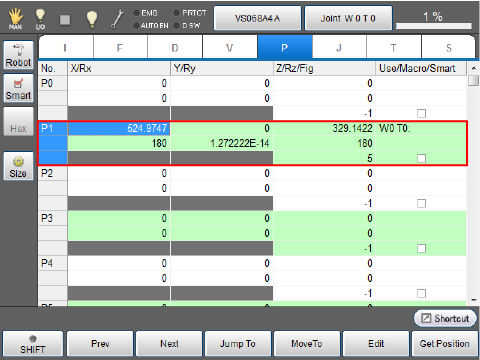 The current position is loaded as variable P1. Coordinate system information is written in Usage (Use/Macro/Smart) cell.