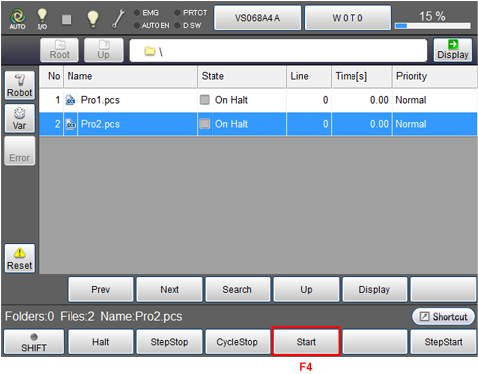 Select the program to start by using cursor key or jog dial, or by directly touching the screen.