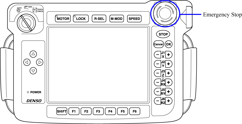 - Motor will be turned off at the emergency stop; however, robot may unexpectedly move by inertia.