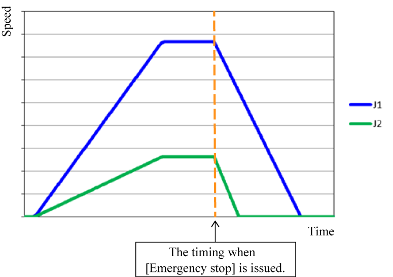 If your controller is version 2.1.* or higher, you can select the stop process for the version 2.0.* or before as well. To do so, set the VRC parameter [48 : Stop process of robots at the emergency stop] to [0 : Stop at the axis maximum deceleration]. Please set the user level to [Maintainer] before the change.