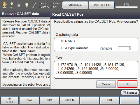 Also, the CALSET position that has been edited directly from the Recover CALSET data window can be saved in J-type variables by pressing [F2 Save CALSET Pos].