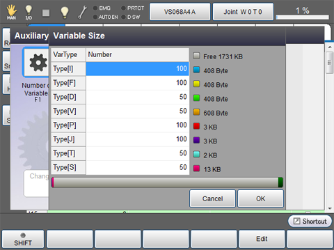 Press [F1 Number of Variables] to display the following [Variable Size] window.