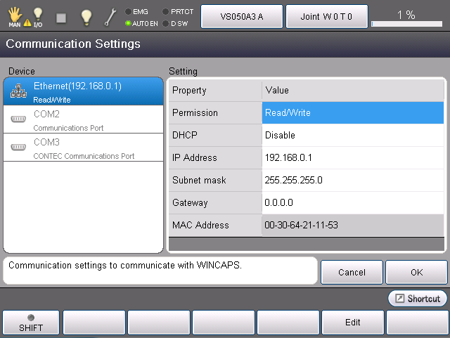 Set the permission and IP address for communications through Ethernet between WINCAPSIII and the robot controller. Also, specify the full/half duplex setting for serial data communications.