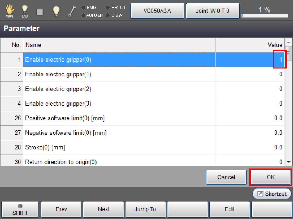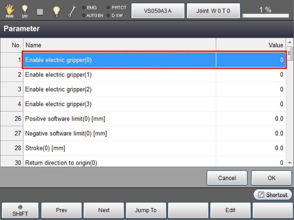 Press [F2 Parameter] to display the screen below. Select the electric gripper number to be activated. For setting, you must start from the smallest electric gripper number.
