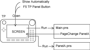 Initially displayed TP panel file is always "Main.pns" in the root (Source files). You can change the display to other TP panel files by describing PageChange statement in the TP panel task.