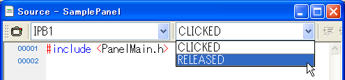 A Source Code Edit window is for specifying the events to take in response to a CLICKED, RELEASED, or other state change event associated with the corresponding part on the panel layout.