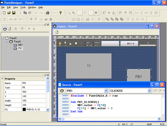Open the Source Code Edit window, select PB1 and CLICKED to create the action source code skeleton, and add the following lines.