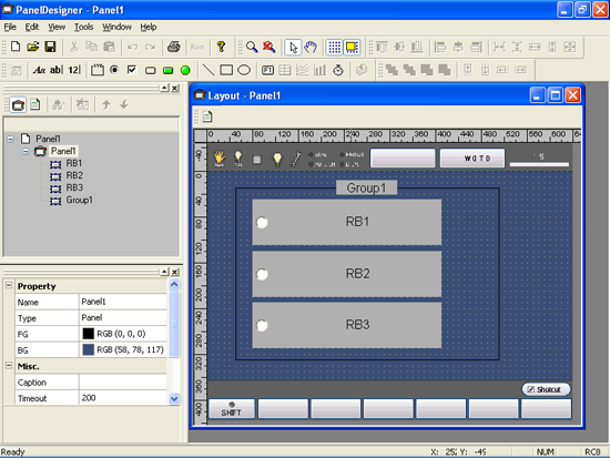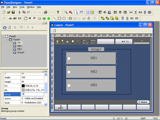 Set the property group for all radio buttons to the group number for the group to ensure mutually exclusive operation of the radio buttons within the group. This example uses group number 0.