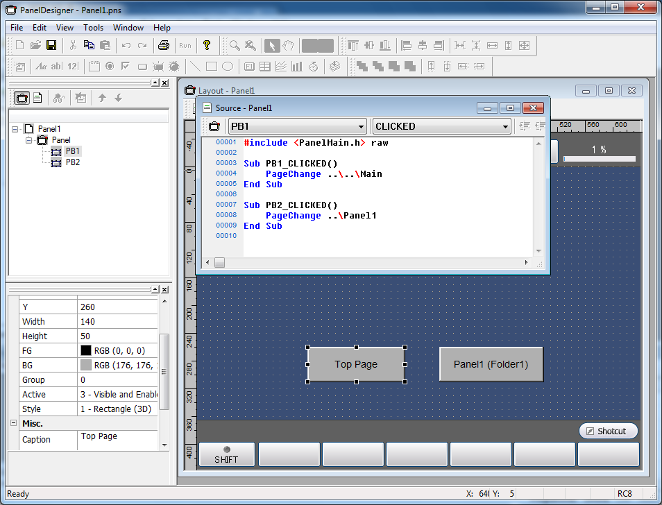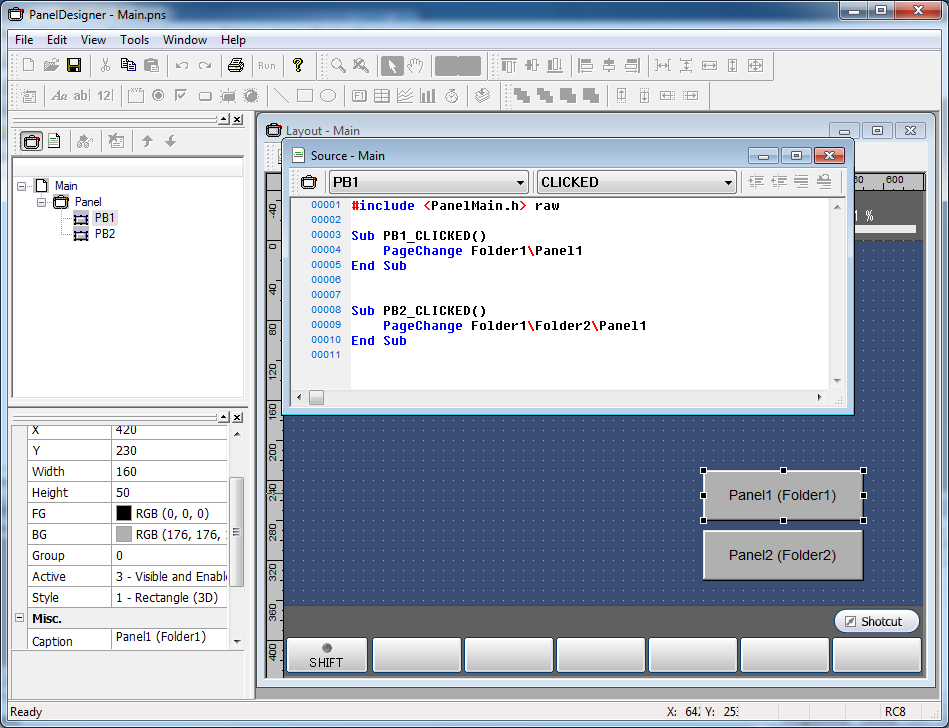 Since one TP panel file can include one TP panel layout only, you need to create a TP panel file as much as the number of TP panel layout you want to create. This sample explains how to create and store three TP panel files in nested three folders. If three files are created in one folder, you do not need to specify the folder name in the window switching command (PageChange command).