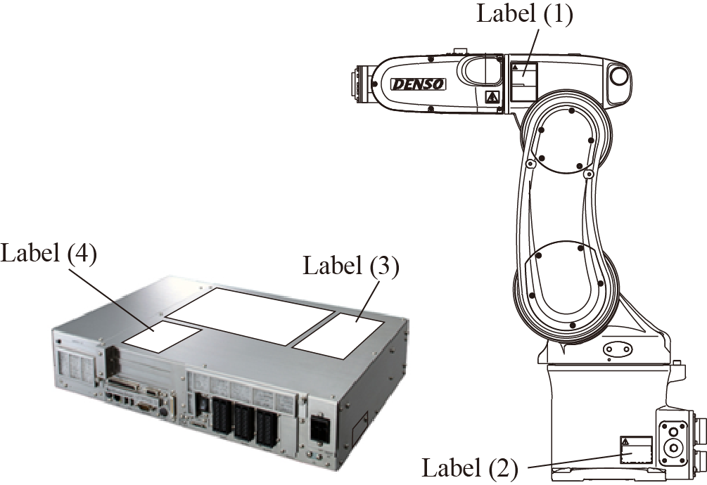 The robot unit and controller have warning labels. These labels alert the user to the danger of the areas on which they are pasted. Be sure to observe the instructions printed on those labels.