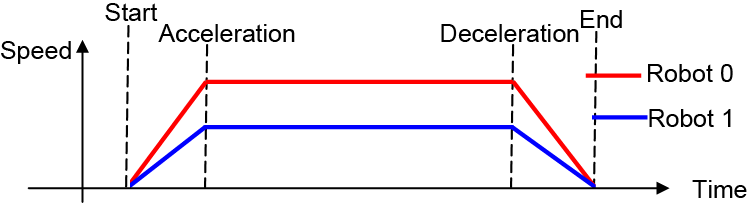 Since the robot controller automatically adjusts the operation timings among different robots, you have no need to create programs for that.