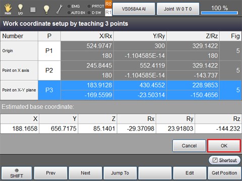"Work coordinate setup by teaching 3 points" window is displayed.