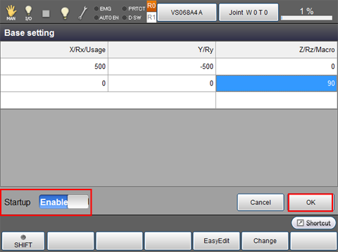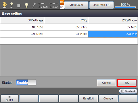 There are two ways to set the base coordinate system. One is to enter immediate values, and the other is to set with Easy Edit window.