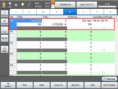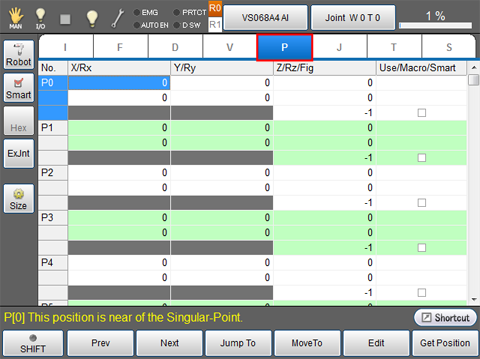 On the bottom of the Get Position window, you will find a small square button written in either "P" or "J". Once you press the "P" button, it turns to the "J" button, and conversely. When the button is "J", the position information of extended-joints are displayed.