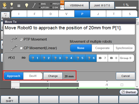 To specify an offset position, press "DevH" button. Once a dialog window appears, enter coordinate values (X, Y, Z, Rx, Ry, and Rz). The robot will offset by specified distances from the current position. You will see the entered values on the left of the "Change" button.