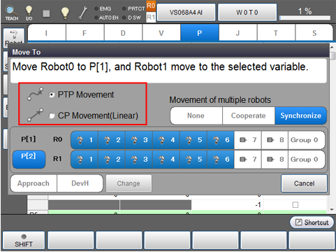 When you press "DevH", a dialog box appears. Enter given coordinate values (X, Y, Z, Rx, Ry, and Rz) and press OK. All robots will offset by specified distances from the position specified by variable.