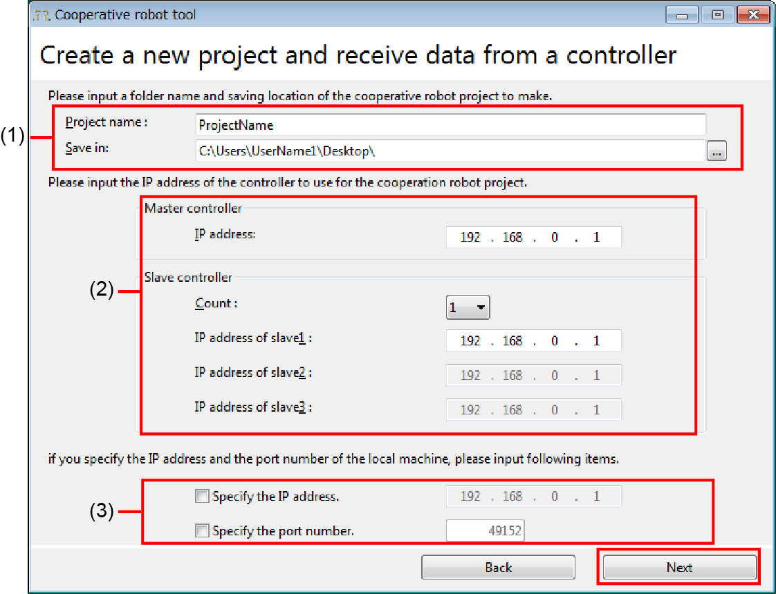2: IP address for the master controller, and specify a Count and IP address of the slave controller.
