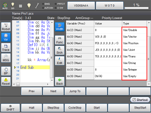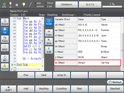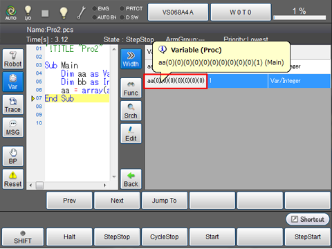 Values of variant variables are displayed N/A when a task is: running, or ; running but in a standby-state, or; Stand-by, or; stopped. - If a Variant array stores any dimensions or elements that exceed the displayable limit, "N/A " will appear in the display of the highest hierarchy. The number of dimensions or elements displayed are specified with program parameters "306:Maximum dimensions for variant variable monitoring" (default:3) and "307:Maximum elements for variant variable monitoring" (default:1000). You can change these settings with the parameters. For details, refer to "Program " in "PARAMETER LIST ".