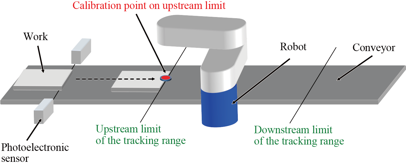 - This is the tracking limit on the upstream of the conveyor. Once a workpiece passes this limit, a robot starts the conveyor catch-up motion.