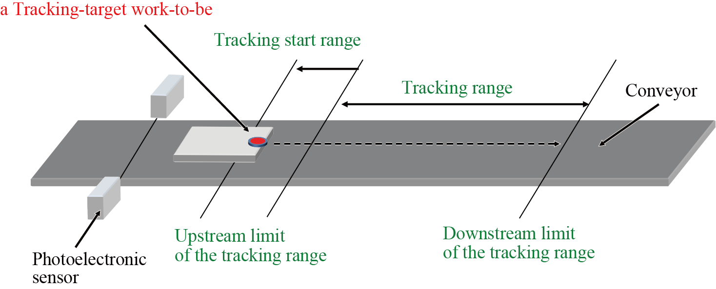 By setting the tracking start range, the system enables to recognize a workpiece that is moved into the tracking range while the robot moves from the waiting position to the upstream limit of the tracking range, as a tracking target work.