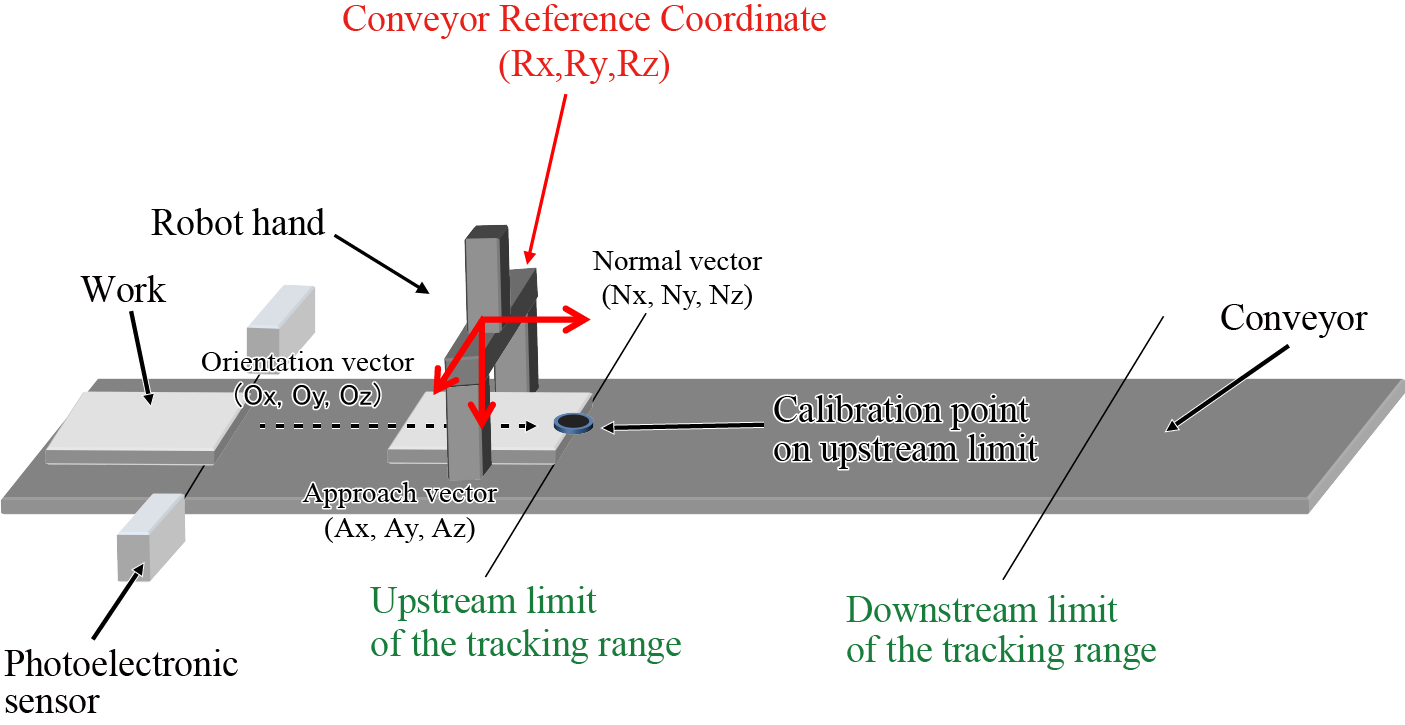 - In the conveyor tracking of RC8 series, conveyor calibration means measuring the exact positional relationship between the conveyor and robot. Specifically, it means measuring the following parameters.