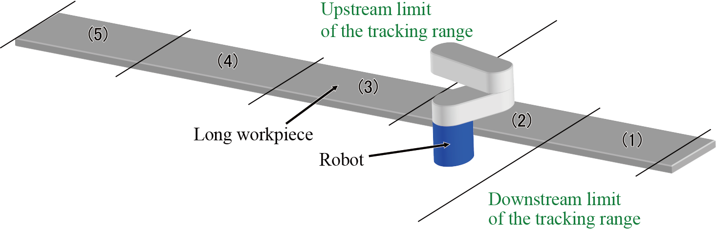 See the figure below. A workpiece is a long object whose length is divided into 5 divisions. In this case, it is impossible to perform sensor tracking for the division 2 to 5 because the top of the workpiece (the most downstream point of the workpiece) has already passed the downstream limit of the tracking range, which means that the workpiece is excluded from the the tracking-target work.