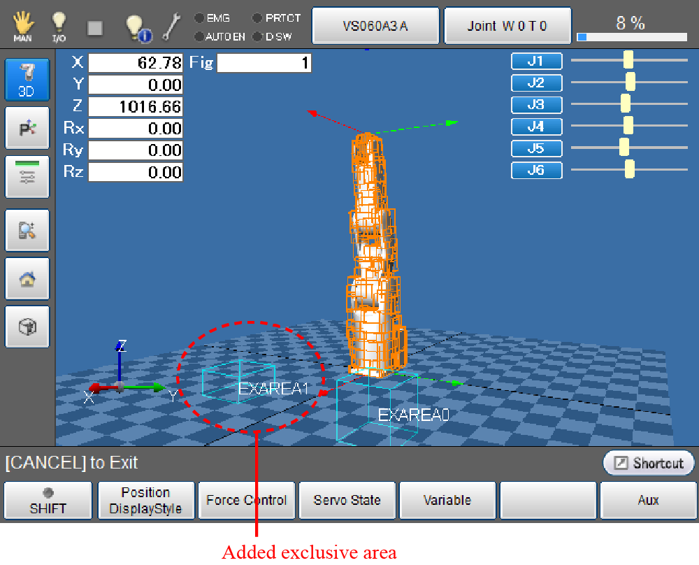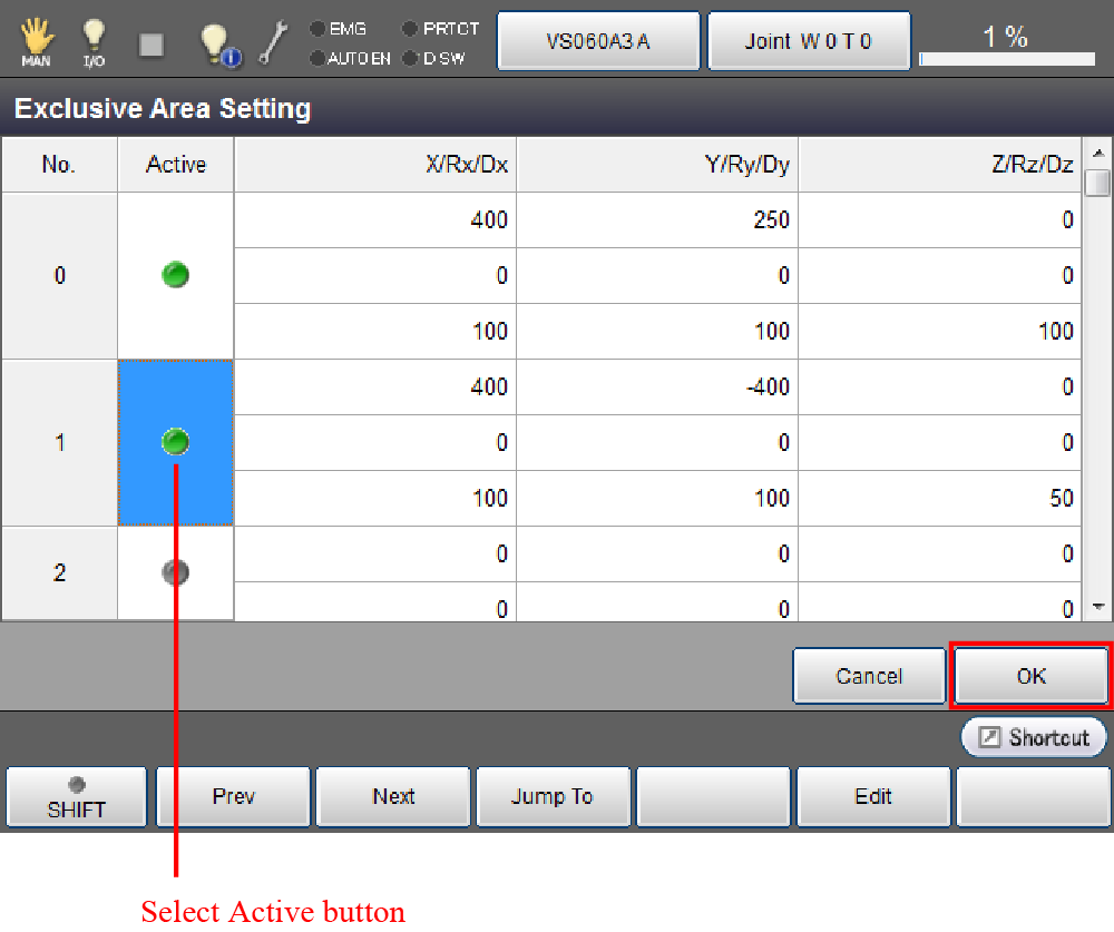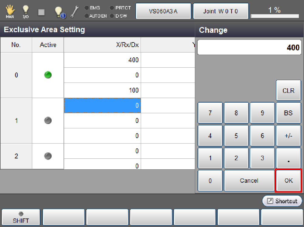 For an area number you want to add an exclusive model, enter each element (X, Y, Z, Rx, Ry, Rz, Dx, Dy, Dz). To change the value, select an element and then press [F5: Edit]. Change the value with the ten key, and then press [OK] to confirm.