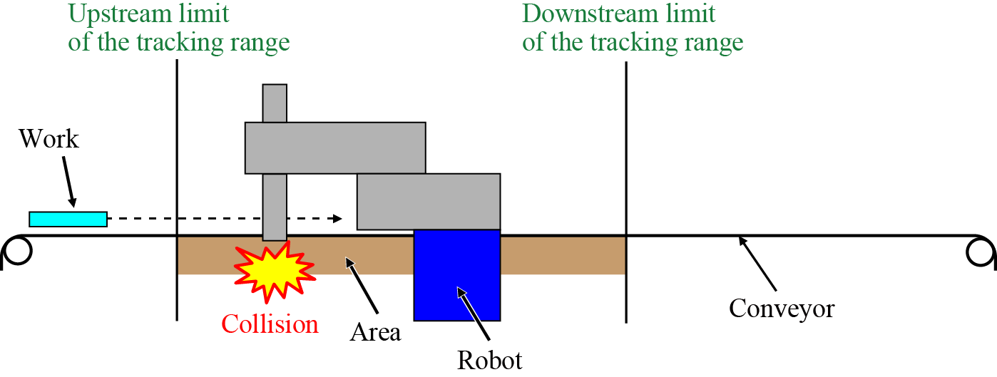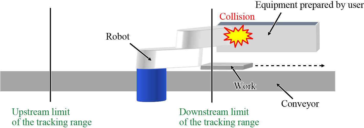 Please pay attention to avoid collisions with equipments placed behind the Downstream limit of the tracking range. It is recommended to perform collision check by using Area function to prevent unintended contact between robot and equipments.