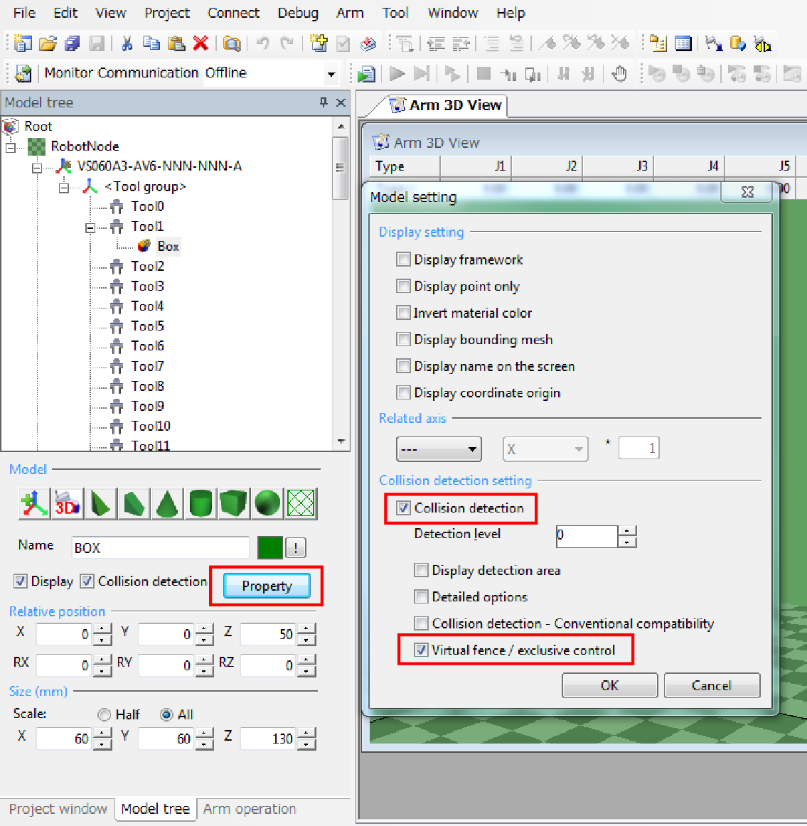 To check output exclusive control data, select [Menu] - [Arm] - [Display virtual fence / exclusive control data].
