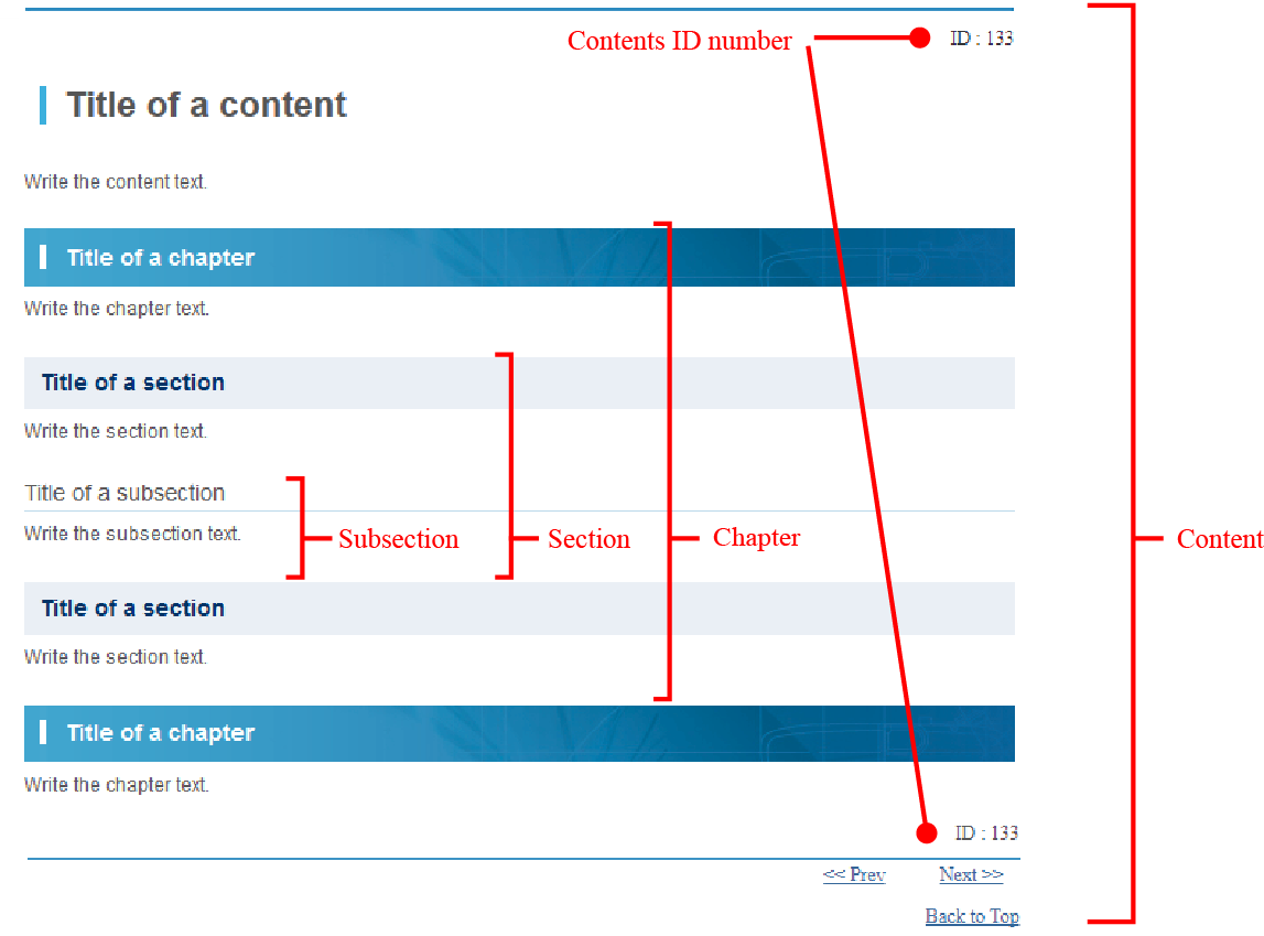 A general content consists of several sets of title and text. One content have the following layers from the top : Chapter ; Section ; Subsection.